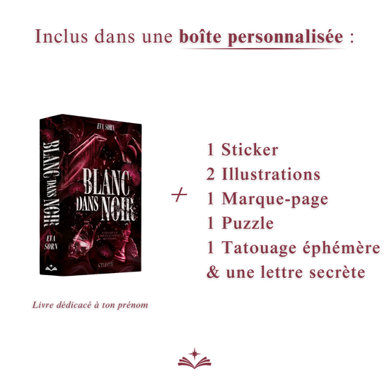 Précommande dédicacée pour Blanc dans Noir de Eva Sorn avec ses goodies : 1 stickers, 2 illustrations, 1 marque page, 1 puzzle, 1 tatouage éphémère et une lettre secrète.